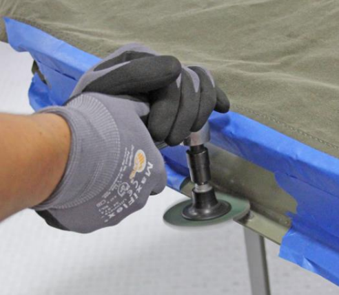 WarningWear protective eyewear and hearing protection when using the pneumatic grinder.CAUTION: Make sure that no metal shavings get into the HV Battery. The HV and LV ports must be sealed to prevent metal shavings from entering the HV Battery.CAUTIONUse only sanding disks that are 80 grit or finer to avoid damaging the HV Battery.