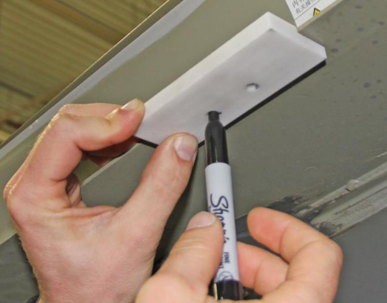 - Put the marking template on the HV Battery and mark both drill locations with a marker.