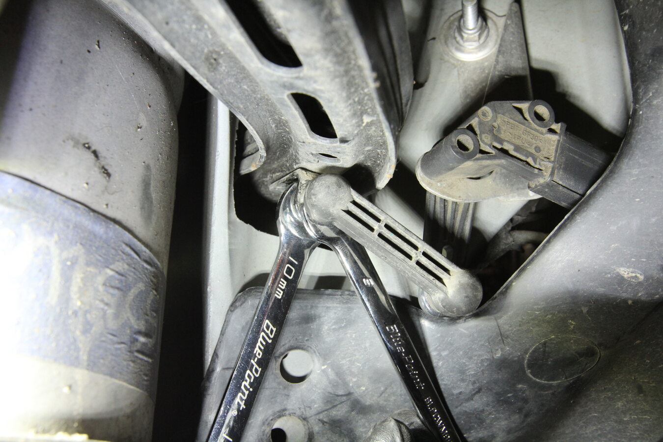 Note1x nut, 10mm, 7 Nm, Install new nyloc nut, Counter hold the joint with a wrench to allow installation