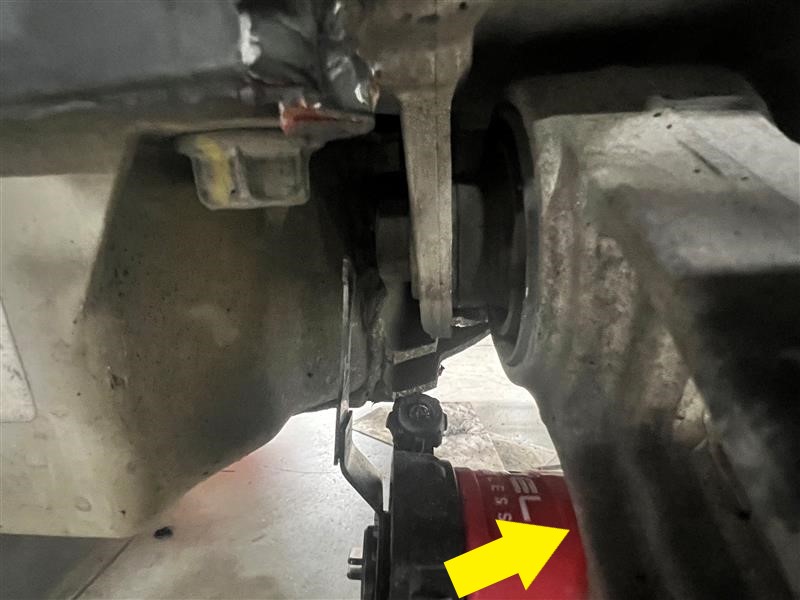 - While continuing to wear PPE, use pliers to remove the body of the cam bolt from the aft link and subframe.