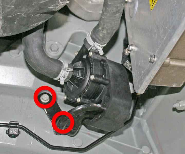- Release the bolts that attach the bracket for powertrain coolant pump 2 (torque 7 Nm). Support the pump.