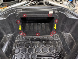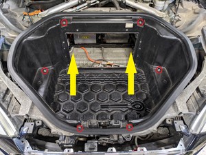 Note4x bolts, 13mm, 8 Nm, 2x bolts, 10mm, 6 Nm, Lift frunk slightly to remove the hood latch cable then remove frunk