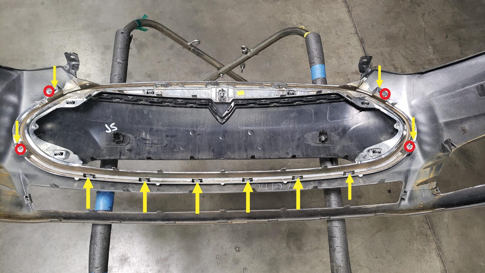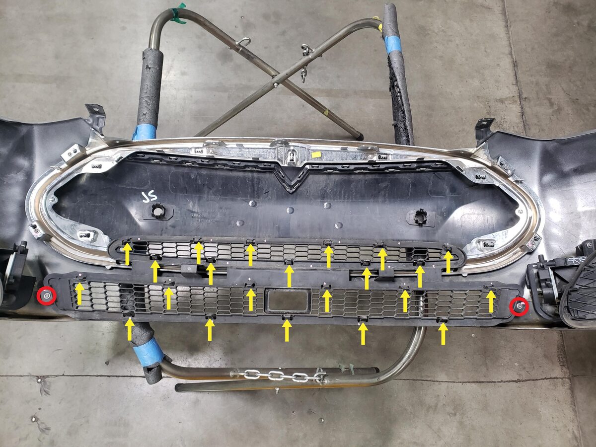 - Release the tabs (x22) and remove the screws (x2) (torque 3 Nm) that attach the front fascia grille to the front fascia assembly, and then remove the grille from the fascia.