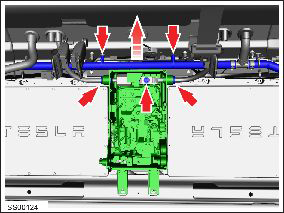 - Release the clips (x2) that secure the charger coolant hose to the heel board.