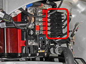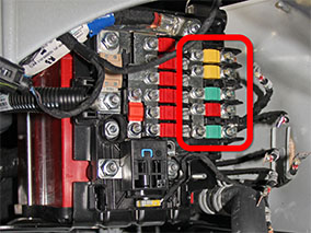Remove the nuts that retain the small-gauge cables and fuses at the RH side
