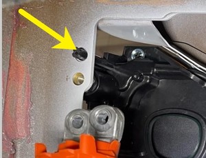 注Nuts have captured washers.注Take caution of any tension present with the busbars. - Release the clip that attaches the charge port manual release cable to the body.