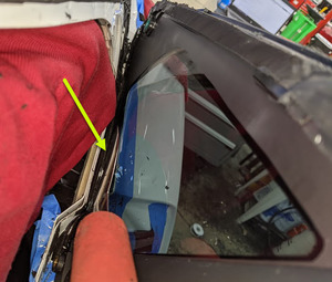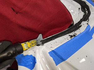 在车身和密封圈之间用方形钢丝缠绕左侧后三角窗的后边缘,并用切割锯切割聚氨酯,使玻璃与车身分离。