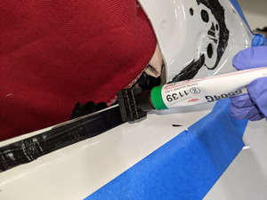 - 使用底漆涂抹聚氨酯路径以及在拆下左侧后三角窗玻璃期间车漆受损的所有区域。底漆至少风干 2 分钟。