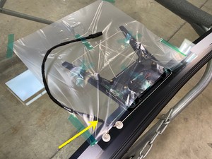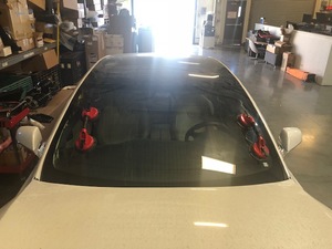 聚氨酯凝固期间,使用胶带将挡风玻璃固定到车身