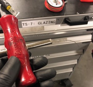 使用 T 柄扳手分割固定挡风玻璃与车身之间的聚氨酯材料
