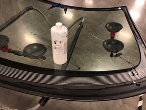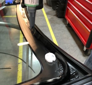 沿着旧聚氨酯痕迹给挡风玻璃和车身涂抹聚氨酯底漆