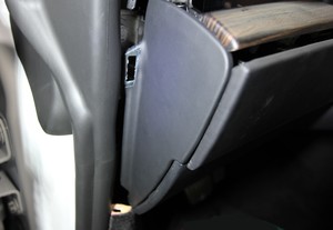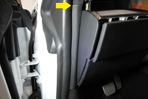 2 个系带夹,1 个卡子,1 个连接器;沿仪表板和扬声器格栅滑动饰板底部,将系带固定到车身侧;从底部开始向上放置卡子;将密封件拉过饰板