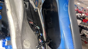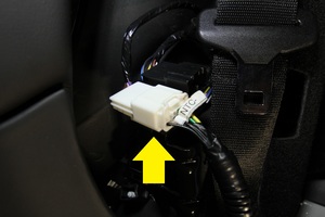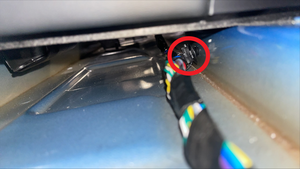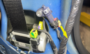 Position chair to gain access below seat bottom and connect LH side body harness to seat controller