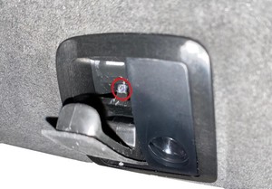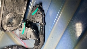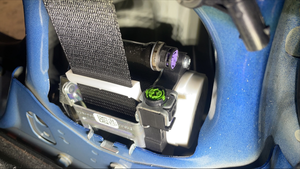 用一字螺丝刀逆时针转动前座椅安全带联动装置的锁止机构,以便将其从预紧器松开,然后将联动装置从预紧器上滑下并将其放置在一旁。