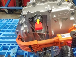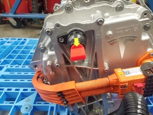 拆下并弃用将后驱动单元直型液力联轴节固定到逆变器的螺栓,然后径直拉出联轴节以将其从总成上拆下。