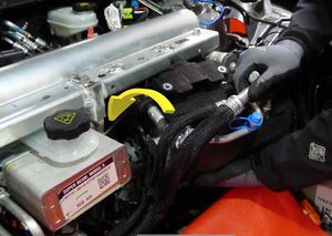 注1 个锁定电气连接器;将黑色锁片从空调压缩机上移开;向下推锁定连接器以释放,并将其直接从插座上拉出