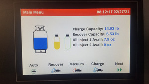 注将耦合器连接到车辆上;顺时针旋转打开耦合器;点击 Main Menu > Recover > Verify hose connection;该过程完成后机器会发出蜂鸣声;车辆可以无人看管;记下或打印制冷剂和机油的回收量;应回收制冷剂 ~2.24 磅(1.02 千克),机油 ~0.3 盎司(8.87 毫升);如果排油量增加超过 1.01 盎司(30 毫升),请参考排油损失图 https://toolbox.teslamotors.com/articles/353700