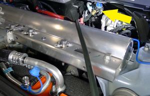 注位于支柱塔梁下;将管线向后移动,直到五通暖通空调管路螺柱从超级歧管板上脱离;将抹布放在管路下面