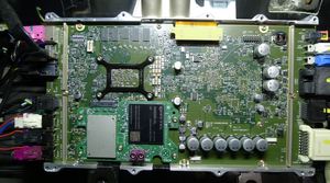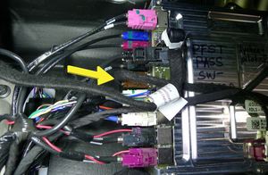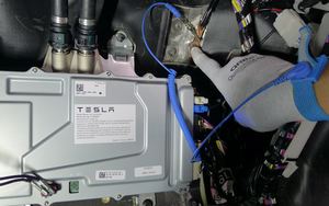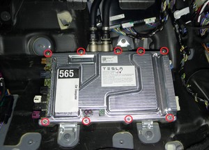小心地将车载电脑连接板向下滑动,断开 PCB 连接器,然后将连接板从车辆上拆下。