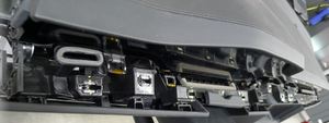松开卡子,然后断开将手机托盘连接到仪表板的电气连接器(3 个)。将中控台手机托盘从车辆上拆下。