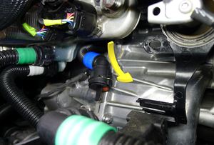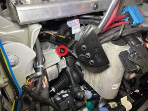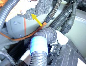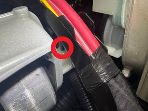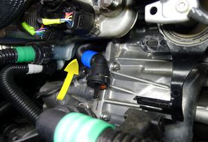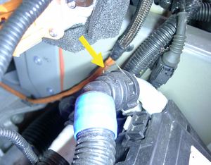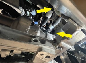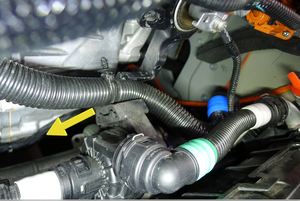 - 移动温控棒电池回流软管,使其从超级歧管和前驱动单元之间以及动力总成冷却液泵上方的空调压缩机支架之间通过。