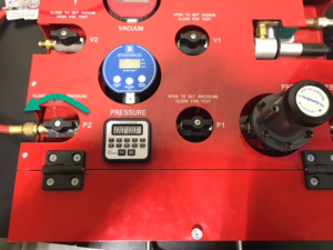 - 如果差值大于 0.8 psi ,请检查是否有泄漏,将 P2 阀转到关闭(垂直)位置,从第 8 步开始重新测试。