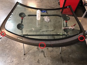 在协助下,将挡风玻璃总成放置在车辆上进行快速适配,标记垫片需要调整的位置。
