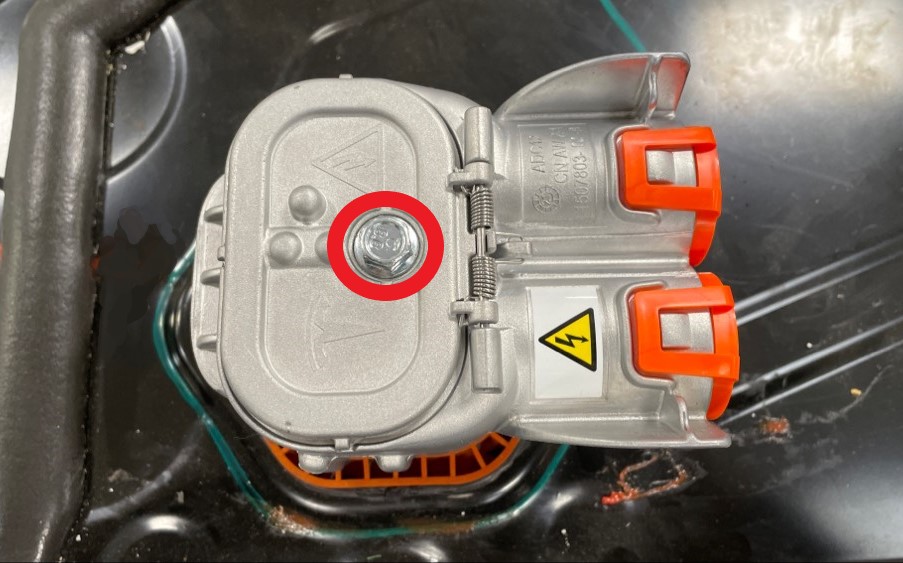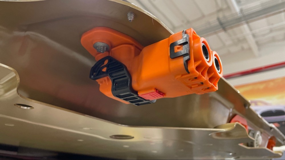 - 将前驱动单元哑插头安装到前驱动单元高压接头上,放下黑色释放把手,然后滑动红色锁片。
