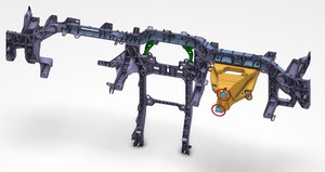 注2 个固定销,2 个弹簧卡子;将驾驶位气囊放在 yoke 方向盘上;将固定销对准卡子;在气囊的一侧向下按压,直到卡子完全就位,然后对另一侧重复此流程;卡子完全就位时会发出清晰的锁止声;对驾驶位气囊总成的两侧进行拉伸测试,确认驾驶位气囊总成与 yoke 方向盘之间的间隙和空间对称