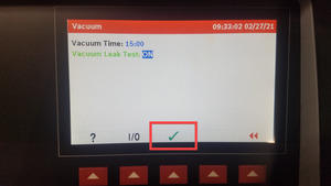 注将真空时间设定为15分钟,泄漏测试设定为 ON;该过程完成后机器将发出蜂鸣声;车辆可以无人看管;在继续之前确认通过泄漏测试