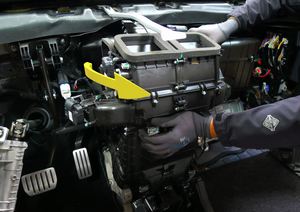 注通过副驾位前车门安装 HVAC 总成的前部,逆时针转动,朝向车辆前方安装