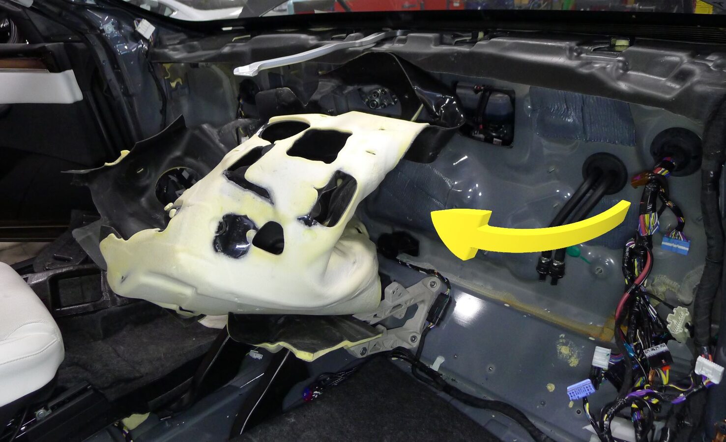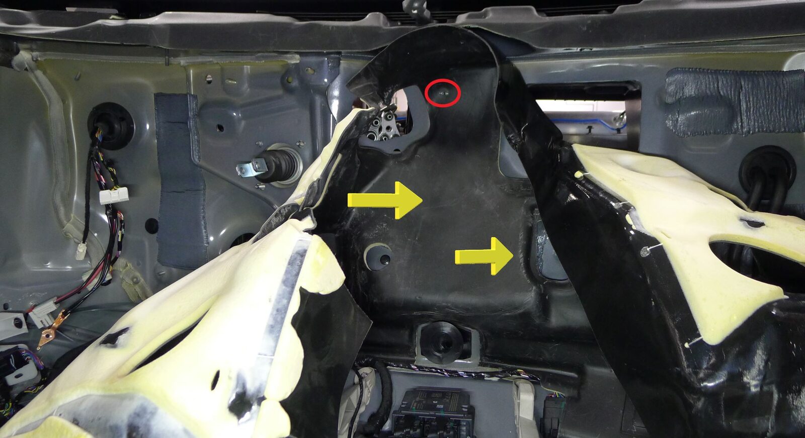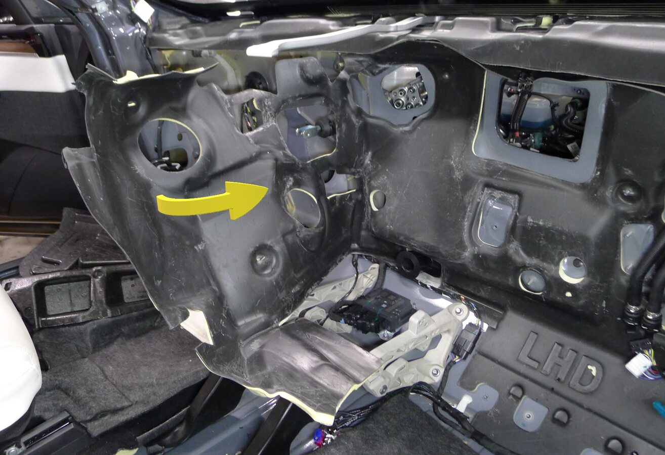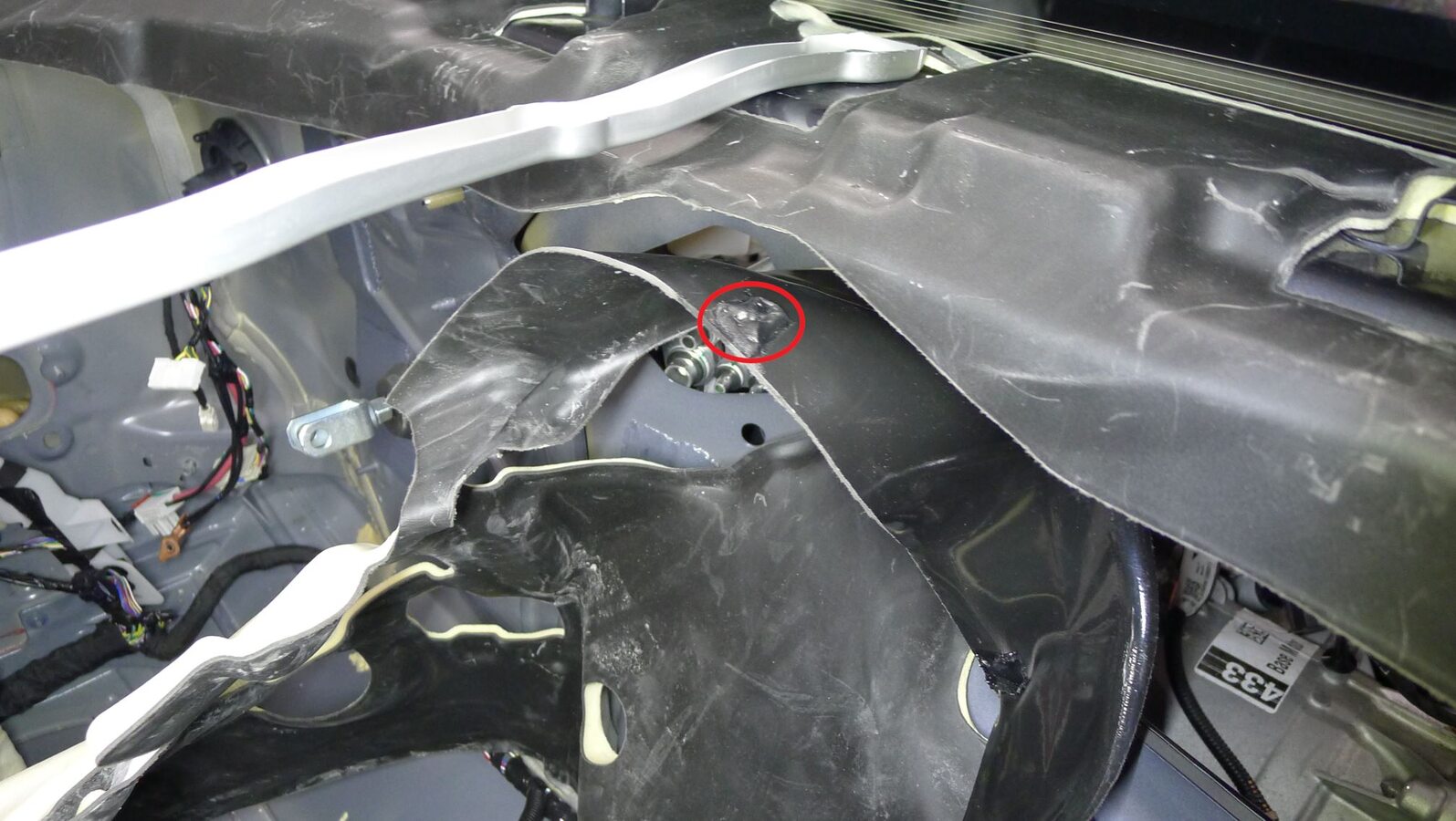 注1 个胀锚螺柱,1 个丁基粘贴片。将前围板绝缘体放置在车辆的中央。固定到胀锚螺柱上。将丁基粘贴片固定到前围板上部板。
