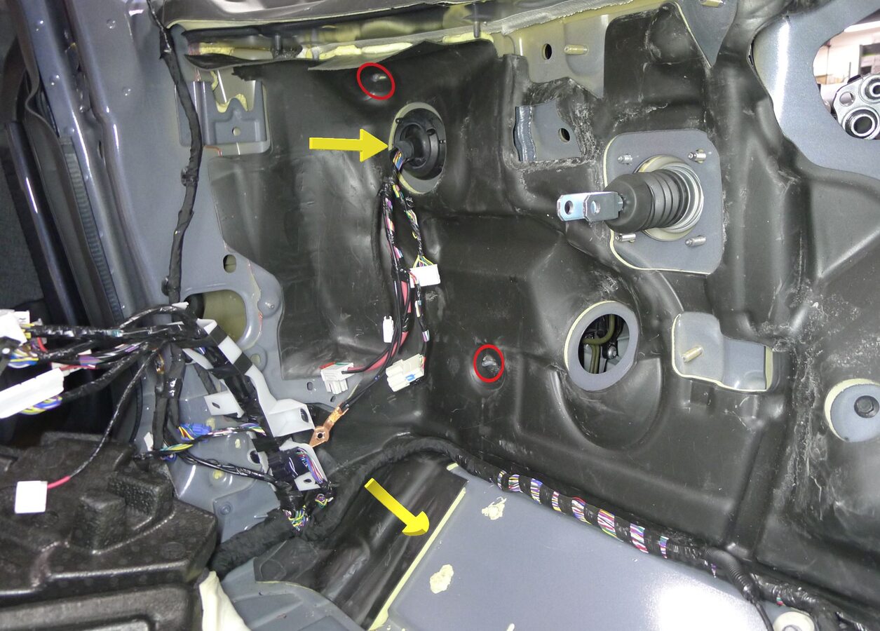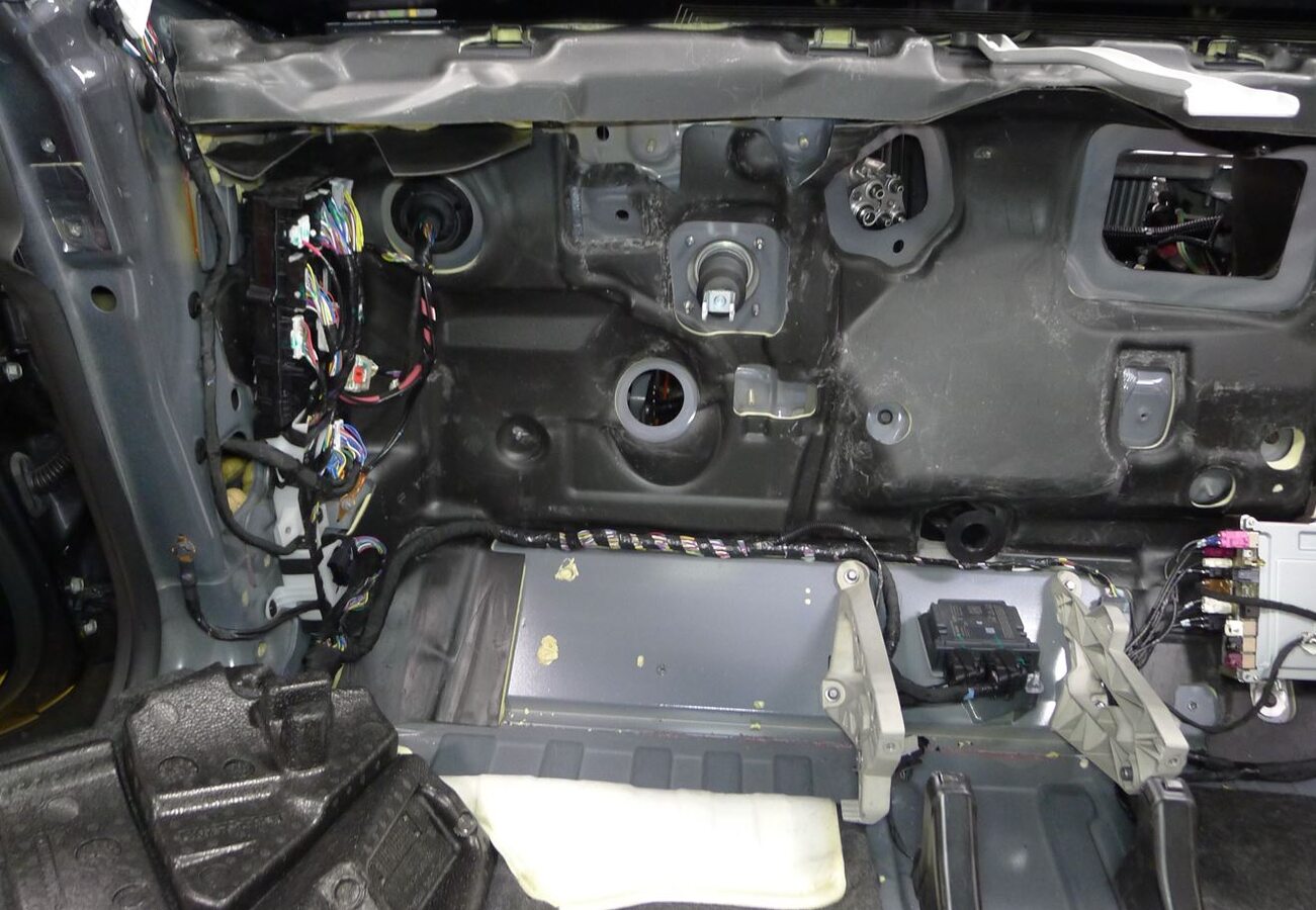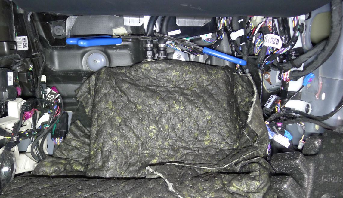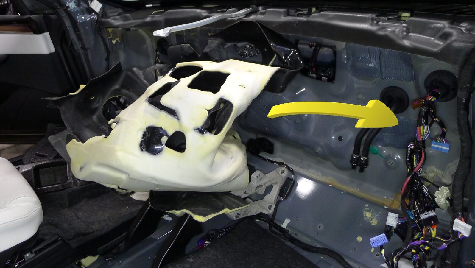 注1 个胀锚螺柱,1 个丁基粘贴片。将前围板绝缘体放置在车辆的中央。固定到胀锚螺柱上。将丁基粘贴片固定到前围板上部板。