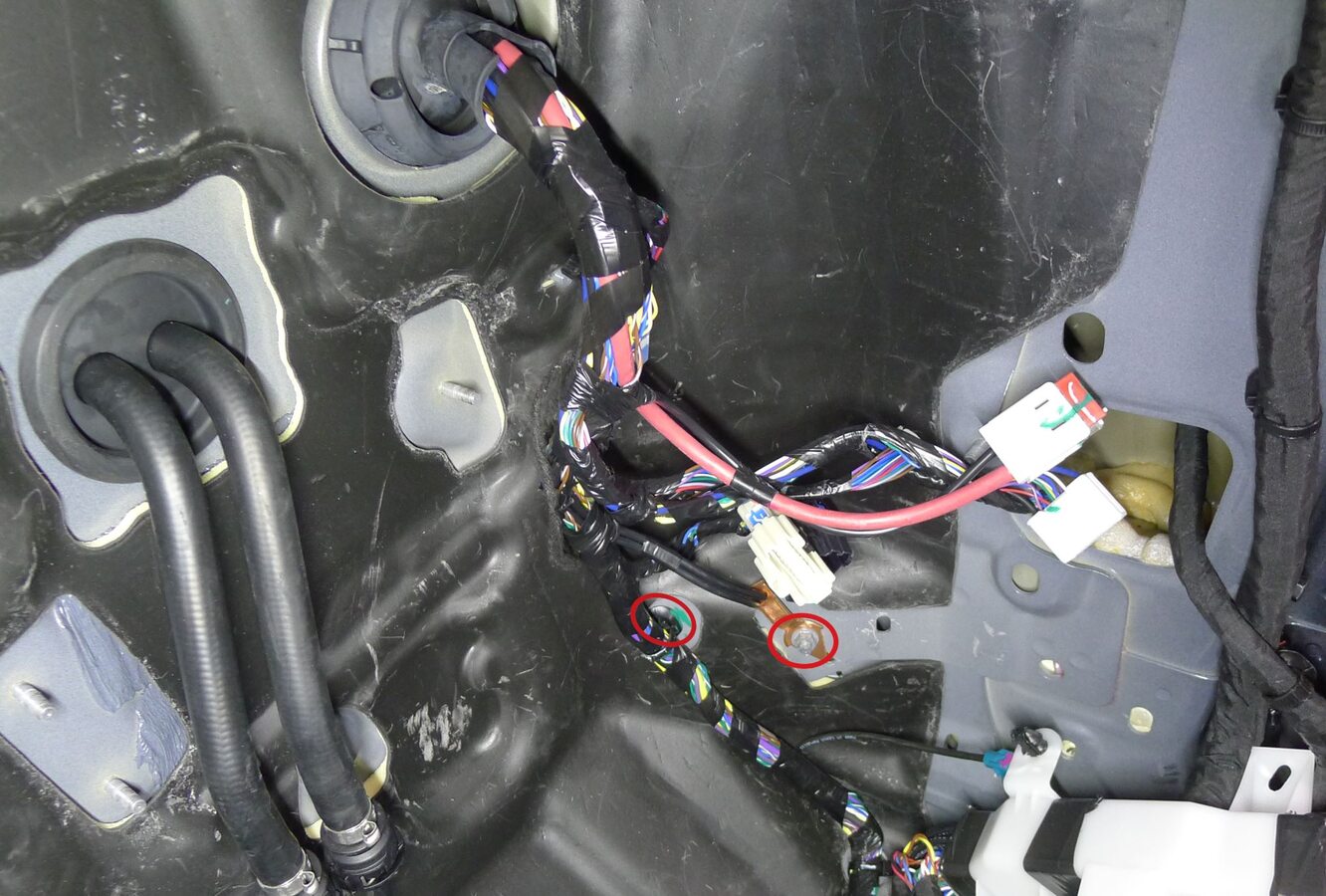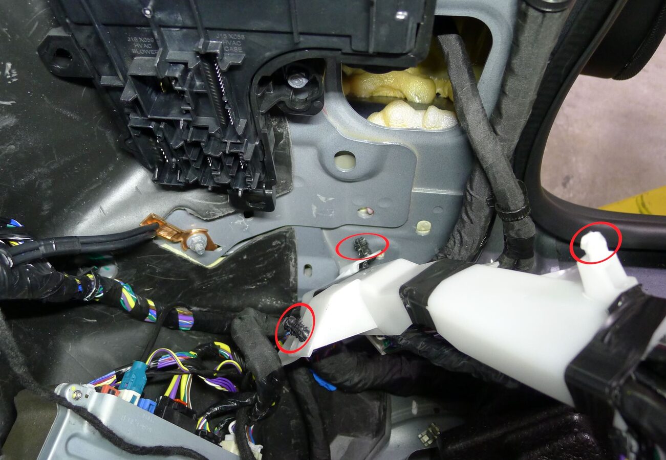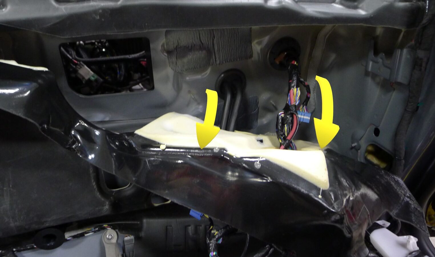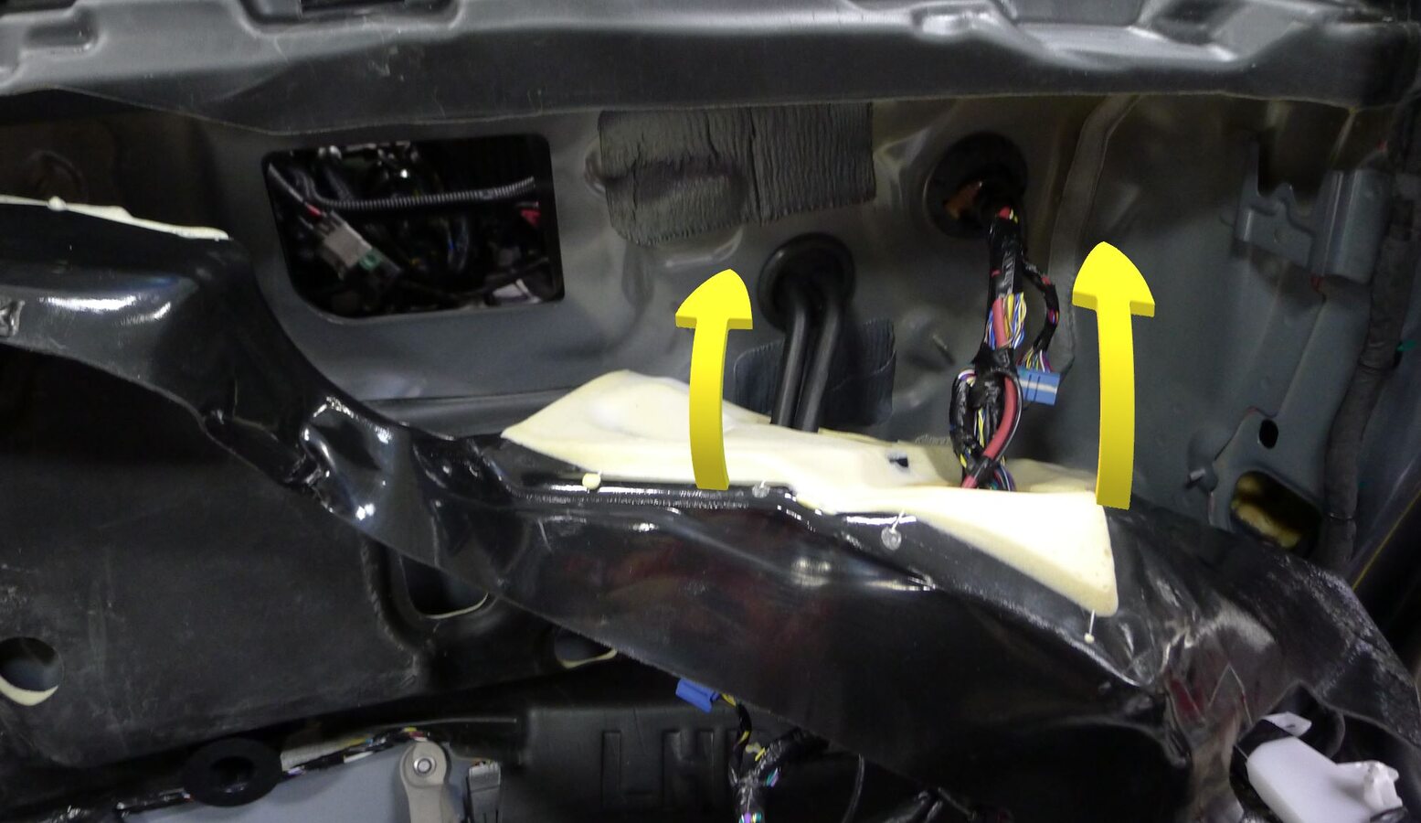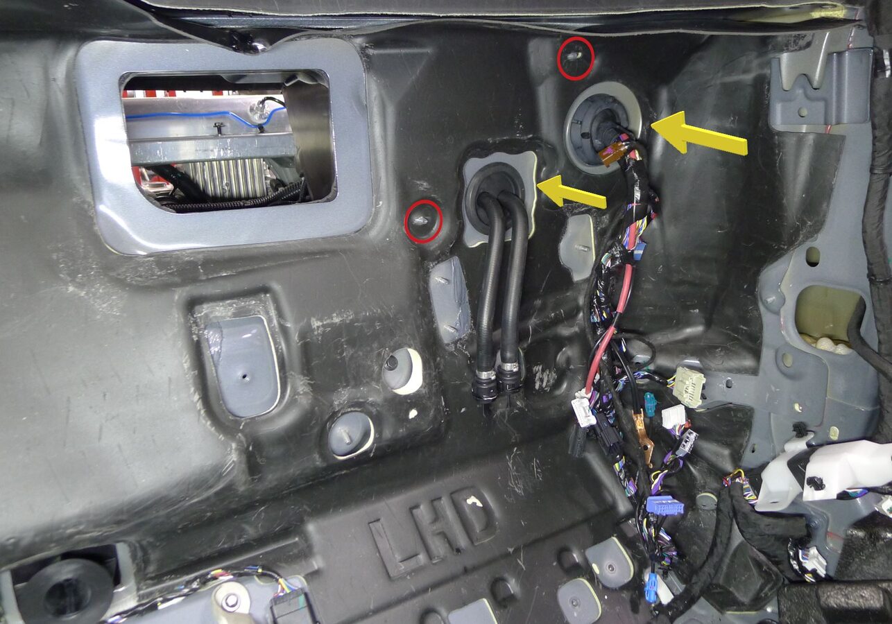 注2 个胀锚螺柱。将绝缘体从胀锚螺柱上拔下。引导 LH FEM 线束穿过前围板绝缘体上的开口。将下部前围板绝缘体引导至 LH 车身线束下方。向内折叠前围板绝缘体,使其脱离前围板。