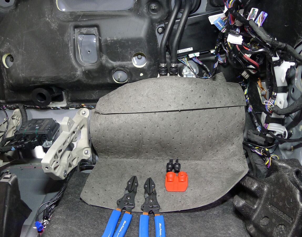 注2 个胀锚螺柱。展开前围板绝缘体。引导 RH FEM 线束和车载电脑冷却液软管穿过前围板绝缘体上的开口。将绝缘体固定到胀锚螺柱上。