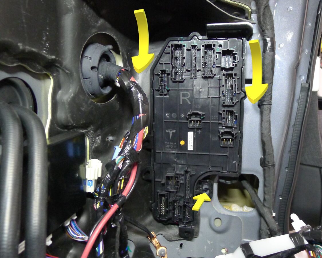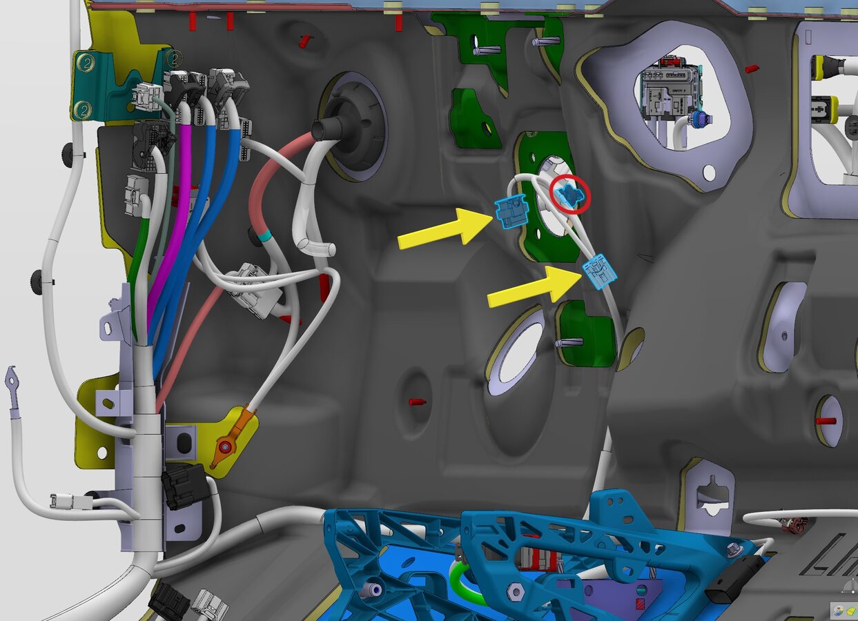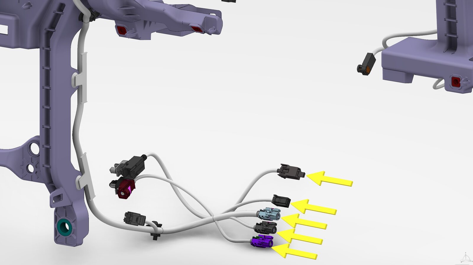 将前端模块 (FEM) 和 RH 车身线束固定到右侧车身控制器上。