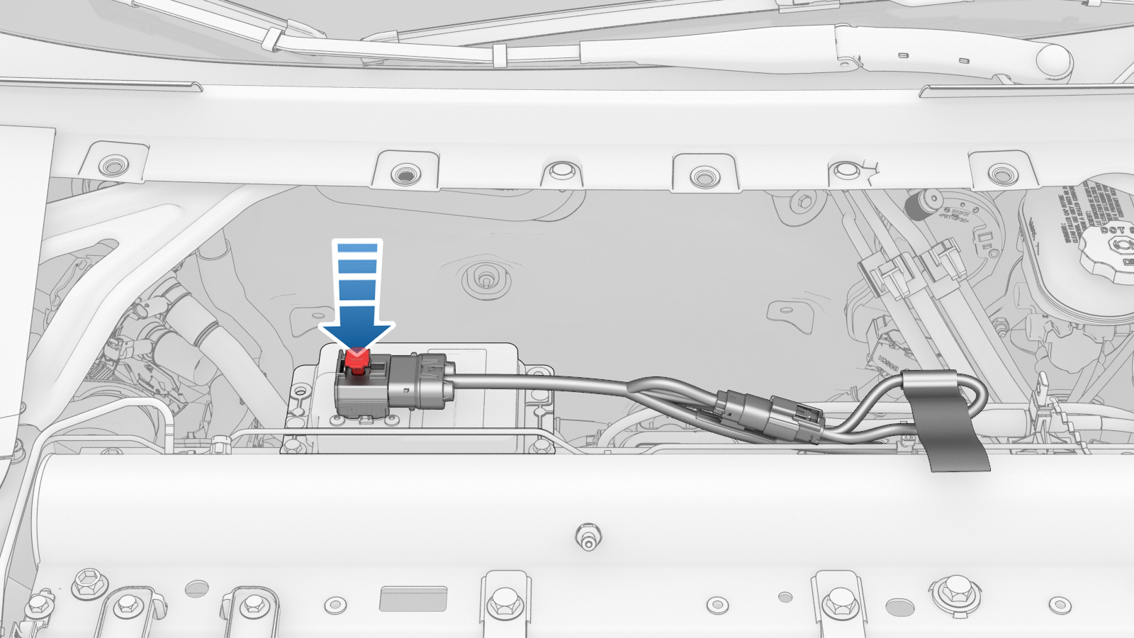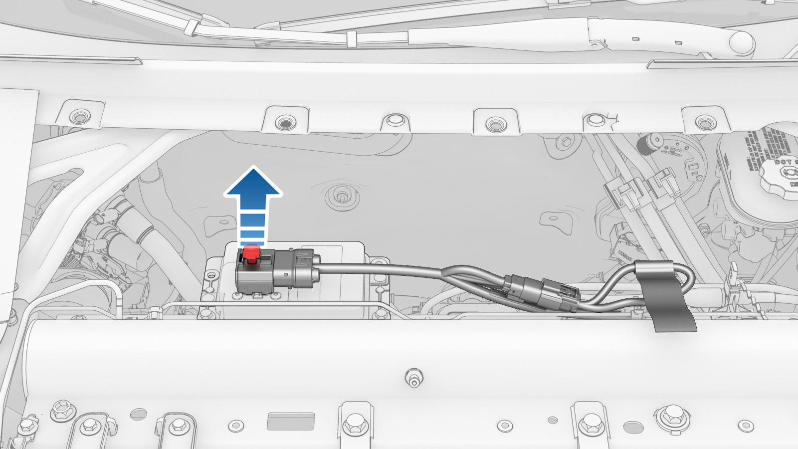抬起低压电池连接器锁片,滑动黑色连接器护罩以将其松开,然后向上拉连接器以将其与低压电池断开。