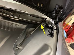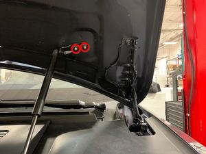 在助手的帮助下,将右侧前备箱盖支柱支架放置到前备箱盖上,然后安装将支架固定到前备箱盖的螺母(2 个)。对车辆左侧重复此步骤。