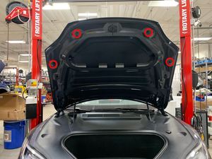 在助手的帮助下,将前备箱盖总成放在车上,然后用手拧紧将前备箱盖左侧和右侧铰链固定到前备箱盖总成的螺母(4 个)。