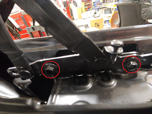 将前备箱盖左侧铰链放置到车上,然后安装将铰链固定到车辆的螺栓。
