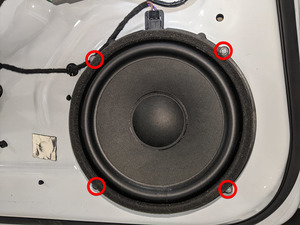 拆下将左侧前车门扬声器固定到车门总成的螺栓(4 个),然后将扬声器从车门总成上拆下。