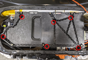 - 拆下将功率转换系统安装托盘固定到高压电池的螺栓(6 个),然后从高压电池上拆下托盘。