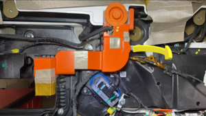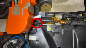 - 紧固高压电池烟火线束夹,揭下保护条,并将贴片锚固件固定在高压控制器上。