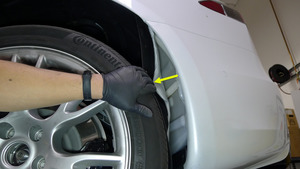 - 拆下将左侧后轮拱内衬固定在后饰板上的推拉式卡子(4 个),然后将内衬移到侧面以便检修。