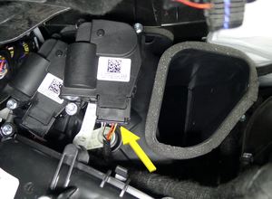 将右侧面板执行器放在车辆上,然后安装将执行机构固定到暖通空调总成的螺钉(2 个)。
