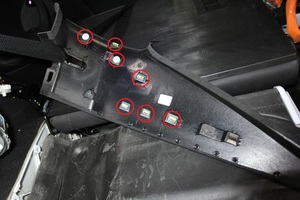- 将左侧 C 柱上部饰板移动到位,然后紧固将饰板固定到 C 柱的卡子(7 个)。