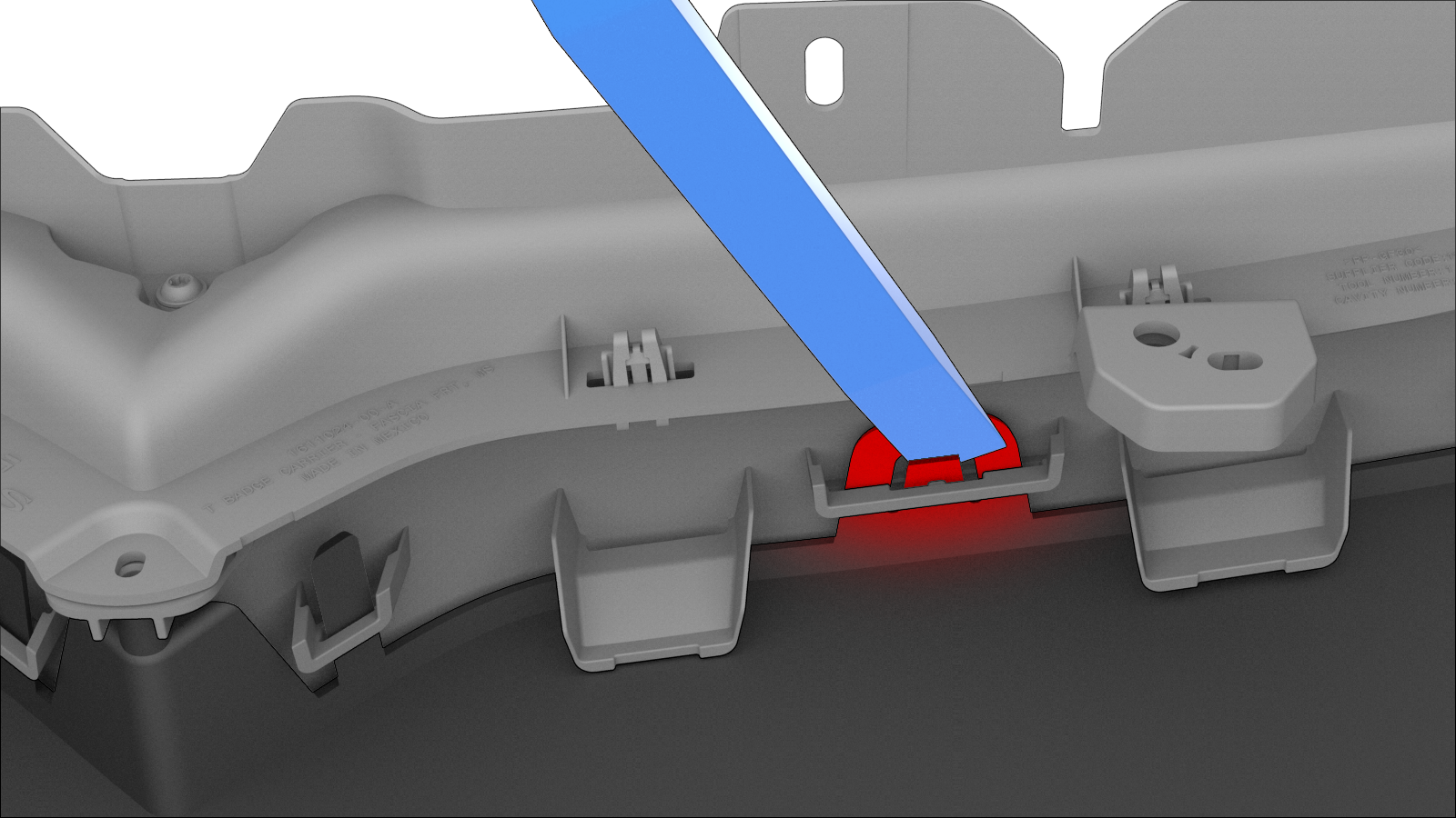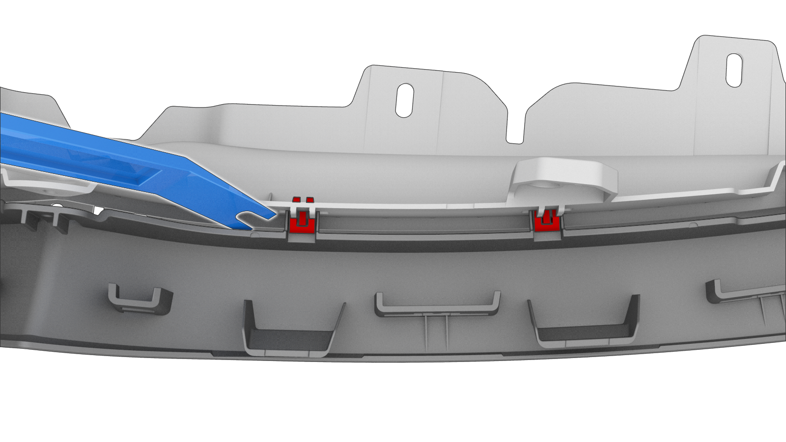 - Release the four clips that attach the front fascia V bar to the T badge support, and then remove the V bar from the T badge support.