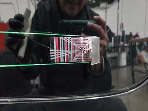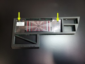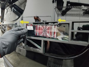 如有必要,将未剥离背胶膜的新 Plaid 图案徽标安装在徽标定位工具上,然后进行快速适配检查。