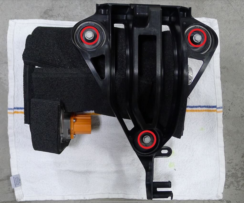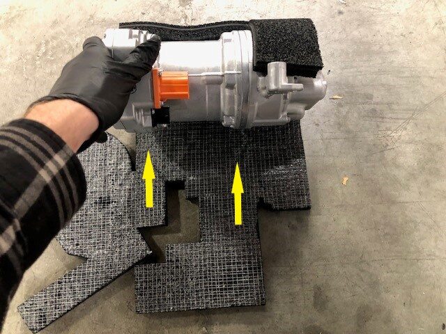 Remove the NVH acoustic cover from the new AC compressor, and then remove any remaining adhesive material from the compressor.