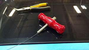 在助手的帮助下,使用 T 柄扳手切割将固定车灯玻璃连接到车身的聚氨酯。